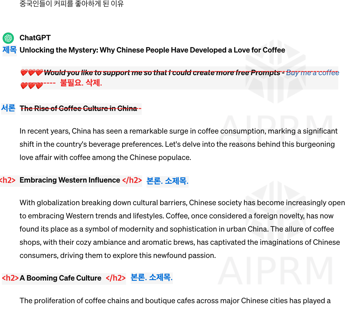 - 글쓰기를 요청하면 아래와 같은 형식으로 답변이 나오게 되는데, 전체 내용을 복사하여 html 글쓰기 창에 붙여 넣는다.