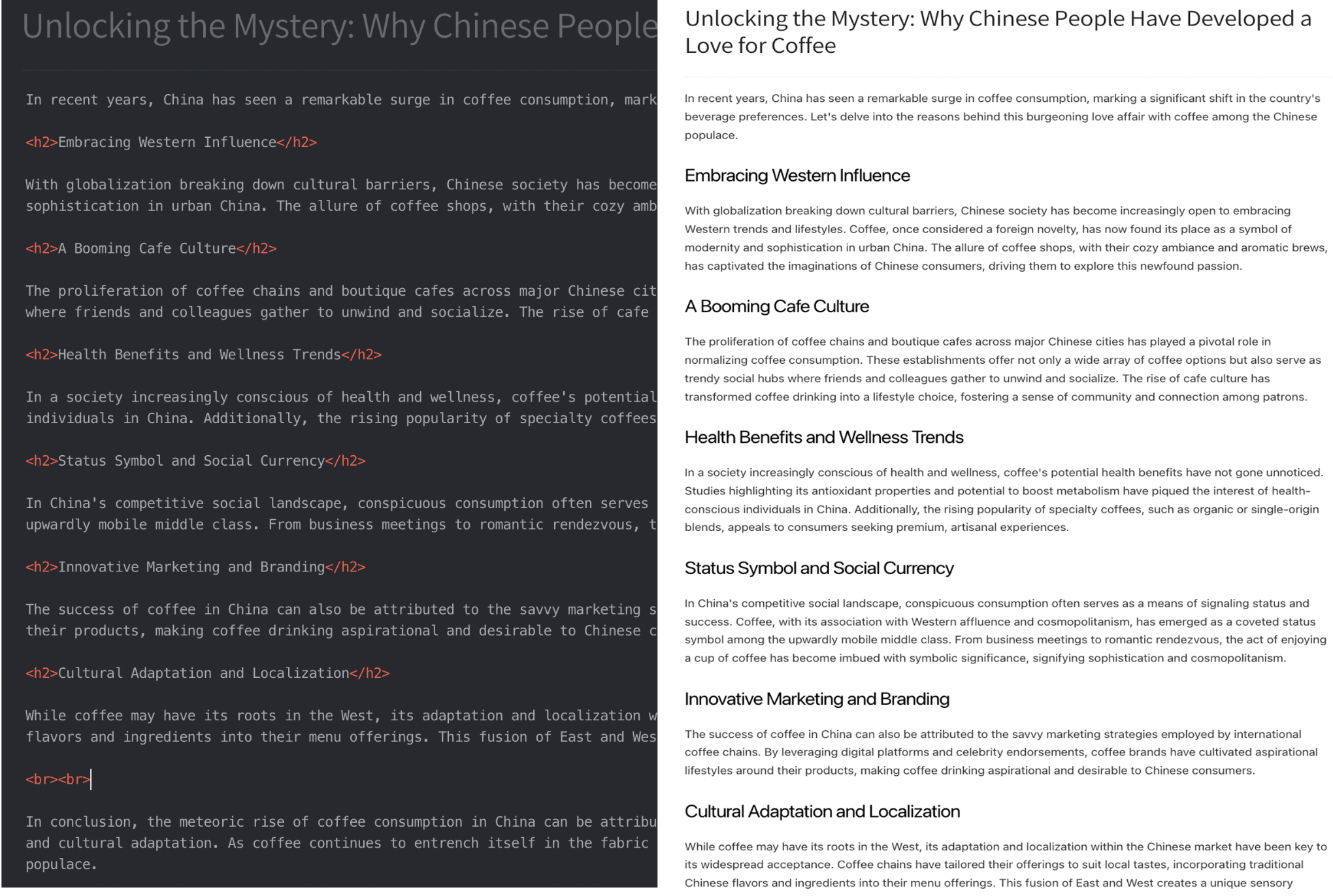 기본모드에 복사한 글을 붙여 넣으면 지저분한 태그가 다 딸려오기 때문에, HTML 모드에서 글을 작성한다. - 소제목 앞뒤로 <h2> </h2>를 추가한다. 행바꿈은 <br>로 표시.