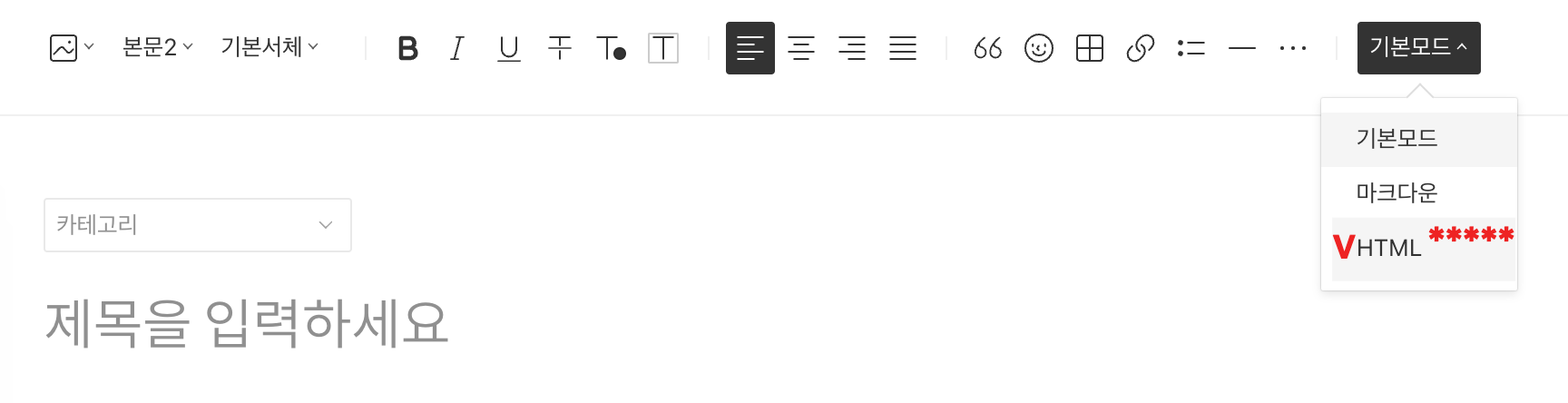 - 먼저 티스토리 글쓰기 모드를 HTML모드로 변경한다.
