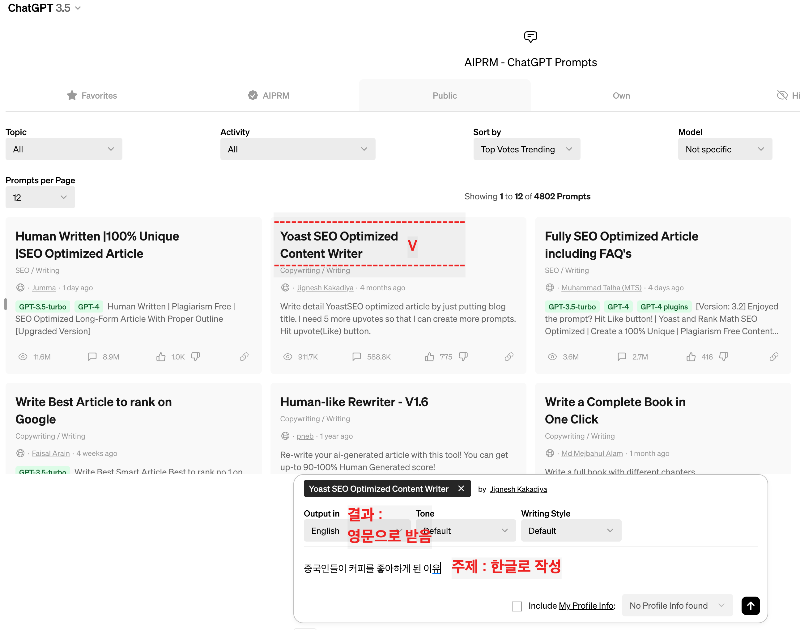 - AIPRM에서 여러 형태의 글쓰기를 지원하는데, Yoast SEO Optimized Content Writer로 선택한다.